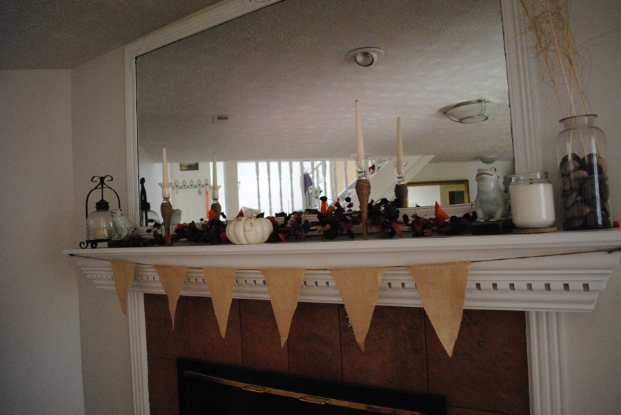 I whipped up some festive burlap bunting with some hot glue and jute. The plan is to add "Fall" to it when I get a chance this weekend.